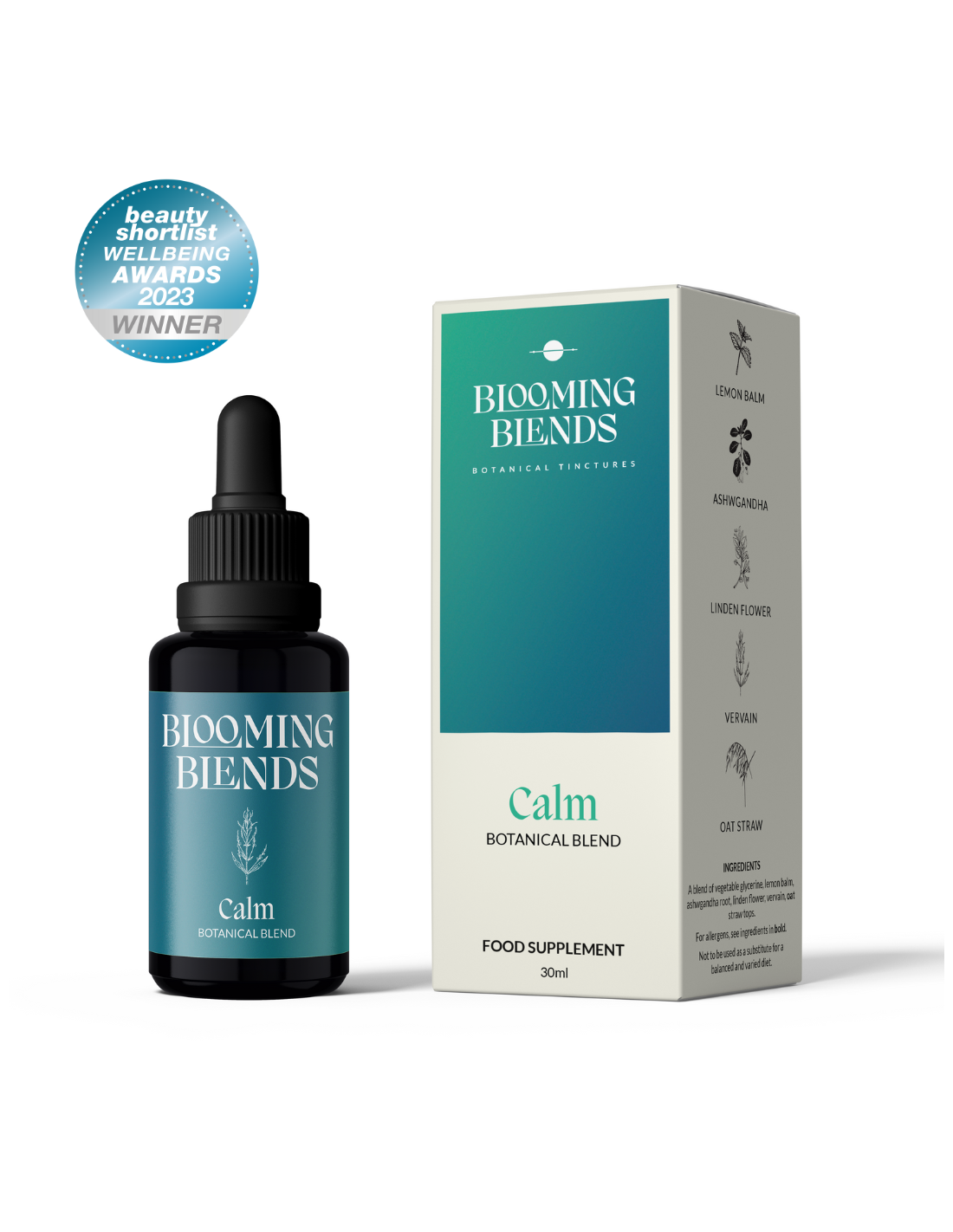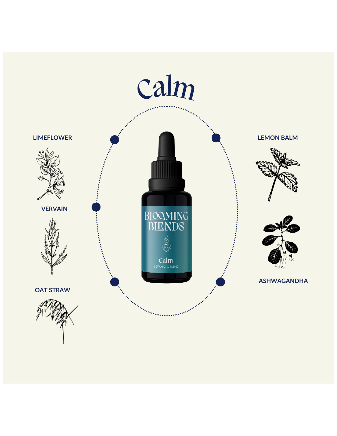 Pflanzliches Glycerin (Rapssaft), Zitronenmelisse (Melissa Officinalis), Ashwagandha-Wurzel (Withania Somnifera), Lindenblüte (Tilia Platyphyllos), Eisenkrautblätter (Verbena Officinalis), Haferstrohspitzen (Avena Sativa)