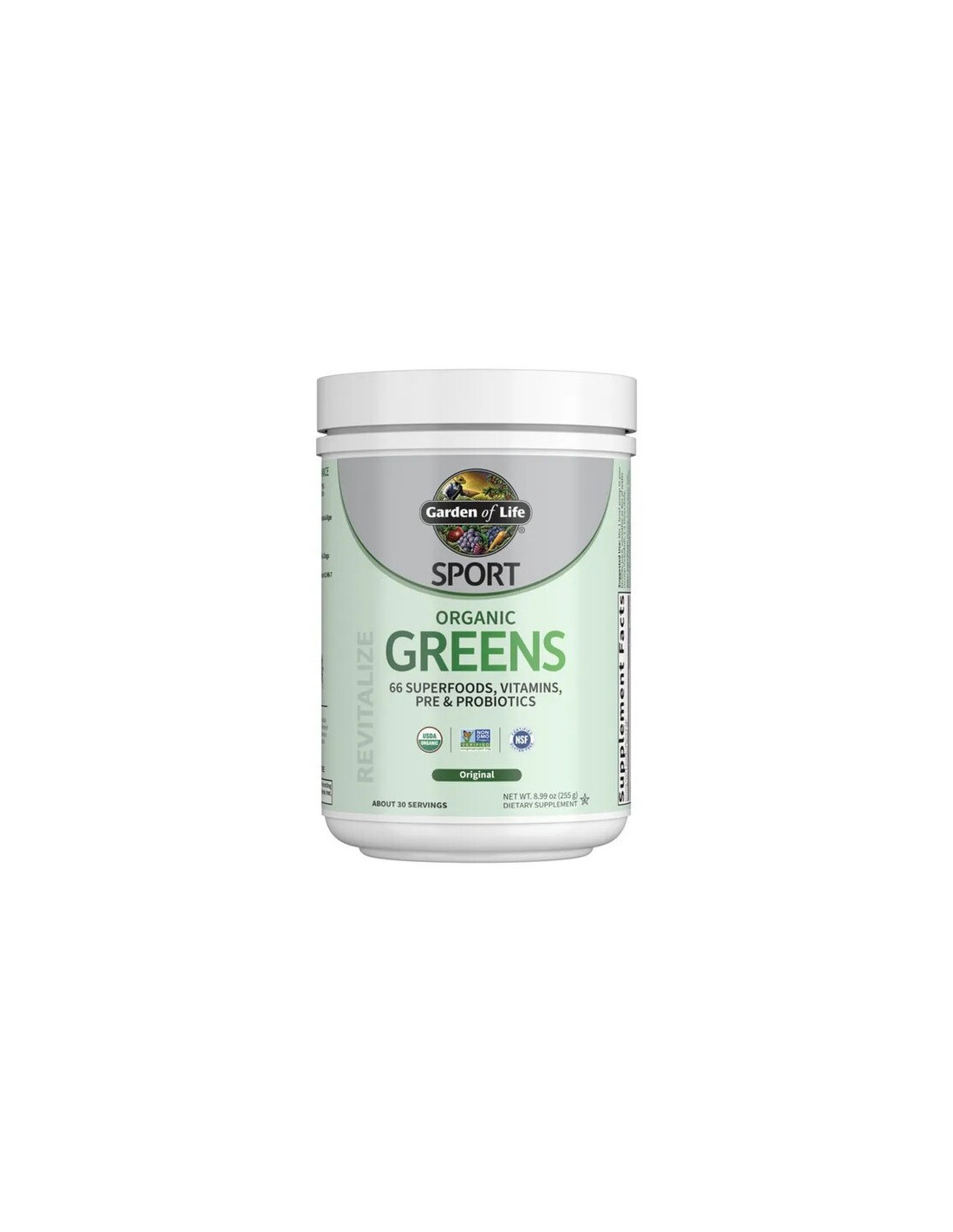 Garden of Life Sport Bio-Grünpulver – Original ist ein Nahrungsergänzungsmittel aus biologischem Grünzeug, Obst und Gemüse, angereichert mit Vitaminen, Mineralstoffen und einem probiotischen Stamm. Das Pulver lässt sich flexibel in Wasser, Saft oder Smoothies einrühren und täglich verwenden.