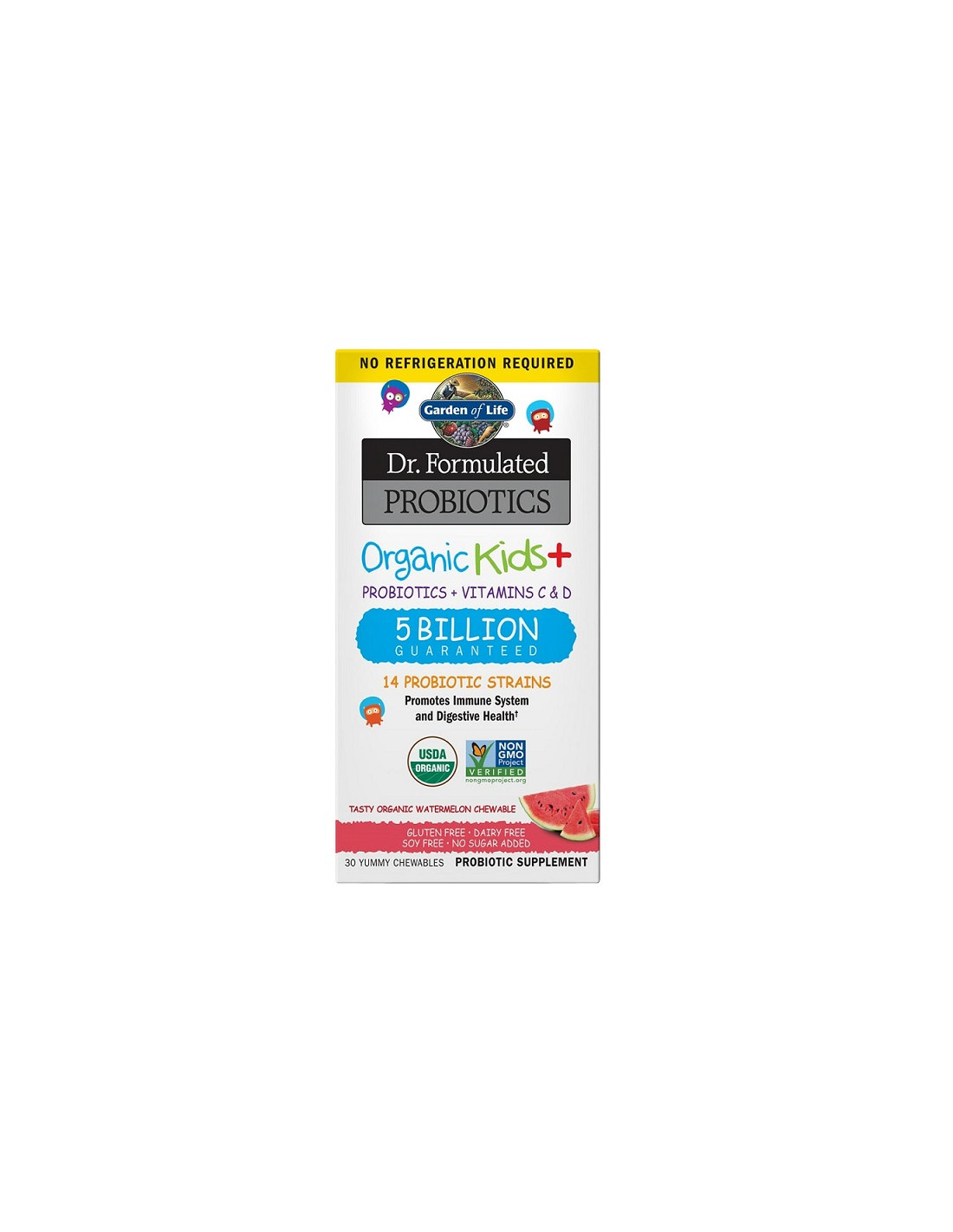 Die Dr. Formulated Probiotics Kids Shelf-Stable Organic Watermelon Chewables von Garden of Life sind Kautabletten mit Wassermelonengeschmack, die speziell für Kinder ab 4 Jahren entwickelt wurden. Das Produkt enthält ausgewählte probiotische Kulturen in Kombination mit den Vitaminen C und D3 sowie organischen präbiotischen Ballaststoffen.