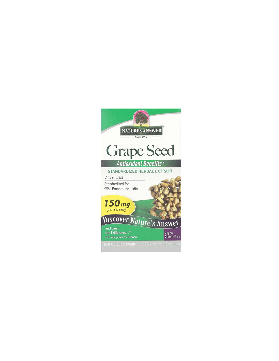 Nature's Answer Grape Seed liefert 150 mg Traubenkernextrakt (Vitis vinifera) pro Kapsel, standardisiert auf 95 % Proanthocyanidine, und wird in einer einfachen pflanzlichen Kapselform angeboten.