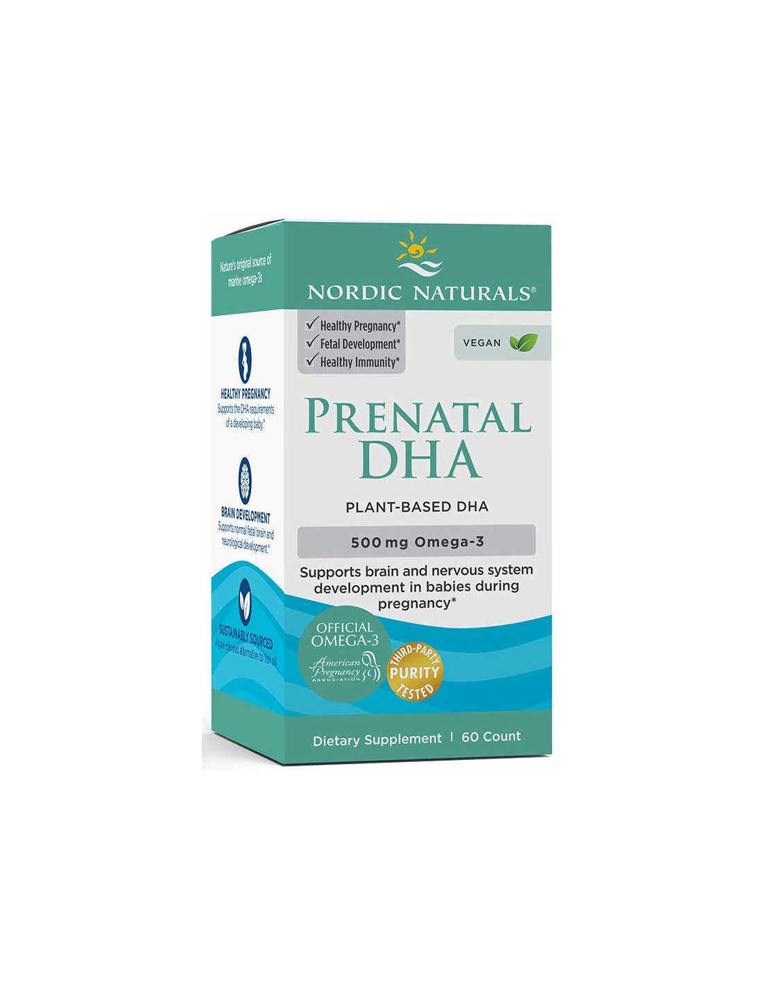 Nordic Naturals Vegan Prenatal DHA liefert 500 mg DHA aus marinen Mikroalgen (*Schizochytrium sp.*) pro Portion. Diese 100 % pflanzliche Omega-3-Quelle bietet eine nachhaltige Alternative zu herkömmlichem Fischöl. Die Weichkapseln sind frei von tierischen Inhaltsstoffen, Gluten, Milchderivaten und synthetischen Farbstoffen und bieten eine reine, vegan-freundliche Formel, die für die tägliche Anwendung während der Schwangerschaft und Stillzeit geeignet ist.