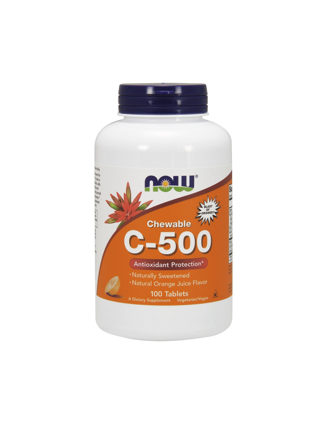 NOW® Vitamin C-500 Orange Kautabletten enthalten 500 mg Vitamin C pro Portion, kombiniert mit Acerola-Extrakt und Zitrus-Bioflavonoiden. Diese Kautablette bietet eine bequeme Möglichkeit, Vitamin C einzunehmen, ergänzt durch natürliches Orangenaroma und gesüßt mit Xylitol und Bio-Rohrzucker.