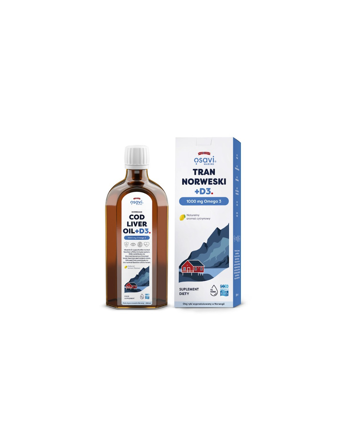 Tran Norweski + D3, 1000mg Omega 3 (Cytryna) - 250 ml. | Osavi