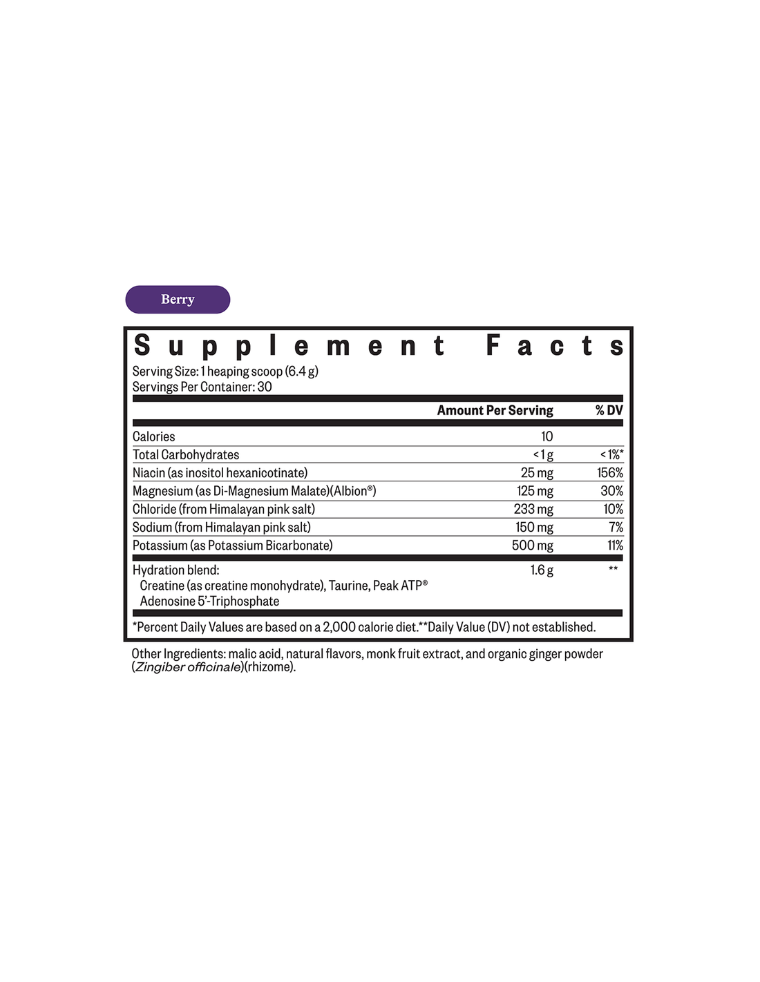 Magnesium (als Dimagnesiummalat), Kalium (als Kaliumhydrogencarbonat), Chlorid und Natrium (aus Himalaya-Salz), Niacin (als Inositolhexanicotinat), Kreatin (als Kreatinmonohydrat), Taurin, Peak ATP® (Adenosin-5′-triphosphat), Äpfelsäure, natürliche Beerenaromen, Mönchsfruchtextrakt, Bio-Ingwerpulver (Zingiber officinale) (Rhizom). Frei von Gluten, Milchprodukten, Soja, künstlichen Farbstoffen und Konservierungsmitteln.