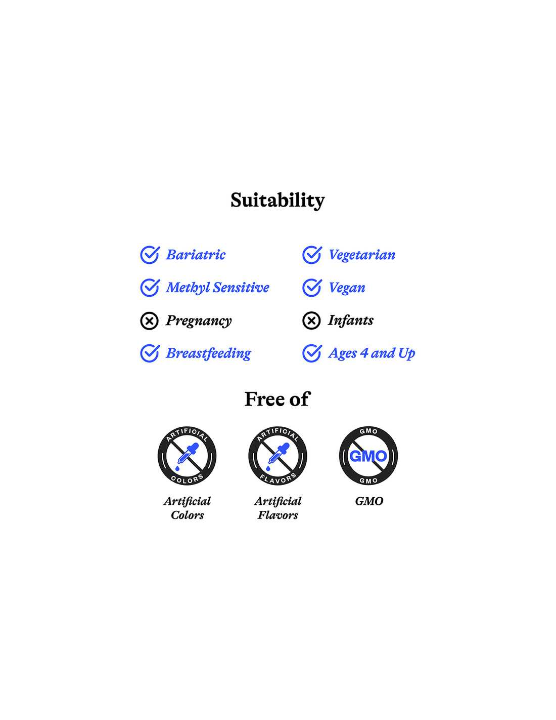 Cellulose, vegetarische Kapsel (Hydroxypropylmethylcellulose, Wasser), verkieselte mikrokristalline Cellulose, Siliciumdioxid, L-Leucin, Maltodextrin, gemischte Tocopherole und Ascorbylpalmitat.