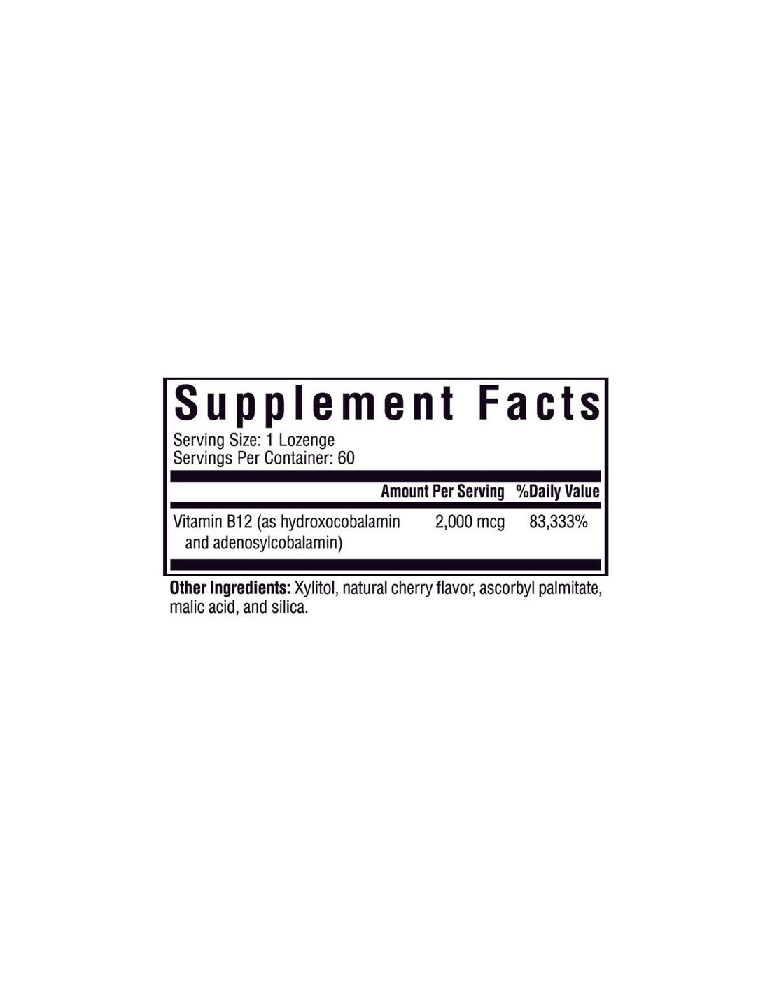Vitamin B12 (Hydroxocobalamin und Adenosylcobalamin), Xylit, Ascorbylpalmitat, natürliches Kirscharoma, Siliciumdioxid. Frei von Gluten, Milchprodukten, Soja, gentechnisch veränderten Organismen (GVO), künstlichen Farbstoffen, Konservierungsstoffen und synthetischen Zusatzstoffen.