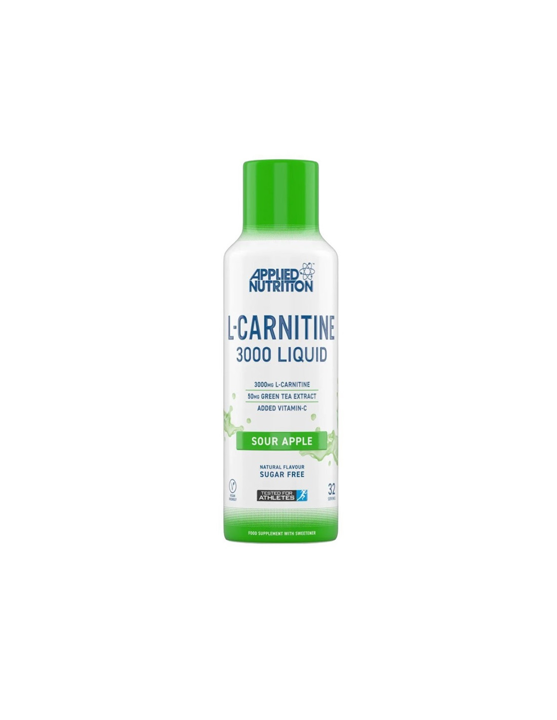 L-Carnitine Liquid 3000 with Green Tea – 480 ml | Applied Nutrition — High-strength liquid food supplement delivering 3,000 mg of L-carnitine per 15 ml serving, with added green tea extract and vitamin C. Suitable for daily use to complement an active lifestyle.