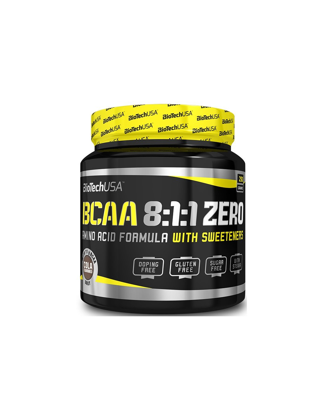 BCAA 8:1:1 Zero - 250 g by BioTechUSA is a flavoured amino acid drink powder with sweeteners, featuring BCAAs in an 8:1:1 ratio. Each daily amount of 15 g provides 11 g BCAAs, including 8.8 g L-leucine. Sugar-free when prepared as directed and gluten-free according to EU regulation.