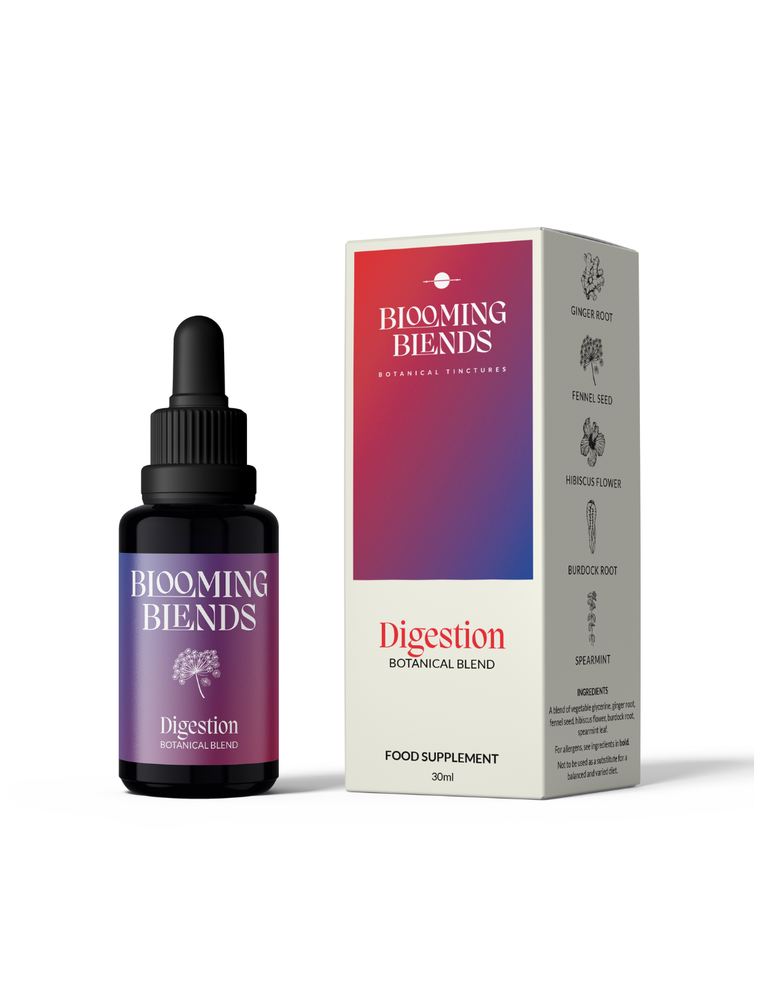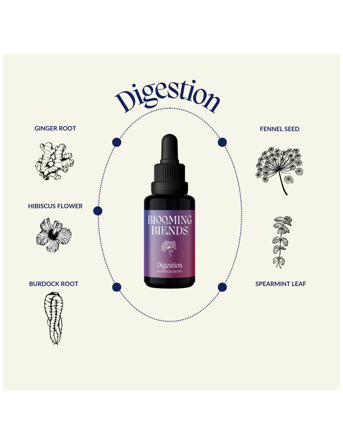 Blooming Blends Digestion Drops (30 ml) provide a carefully crafted blend of traditional botanical extracts including hibiscus, burdock root, fennel seed, spearmint leaf, ginger root, and artichoke leaf. Made with vegetable glycerin for a clean, alcohol-free formulation suitable for daily use.