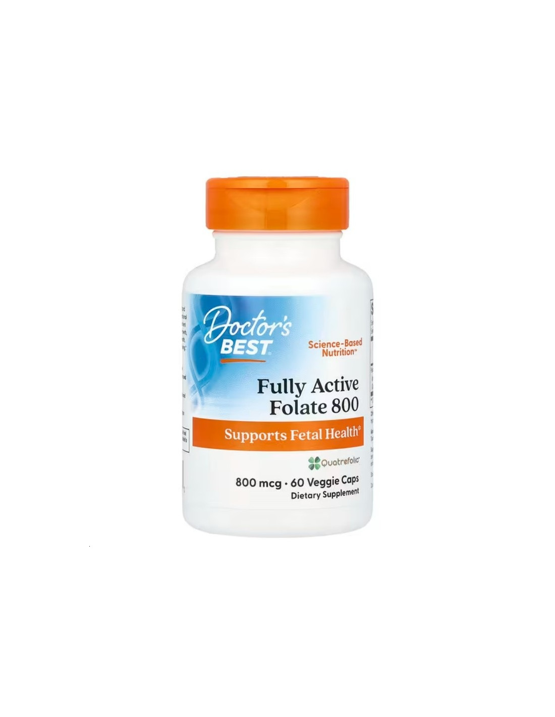 Doctor's Best Fully Active Folate delivers 800 mcg of folate per serving, provided as (6S)-5-methyltetrahydrofolic acid glucosamine salt (Quatrefolic®). This bioavailable folate form is suitable for individuals seeking dietary folate supplementation in a vegetarian capsule format.