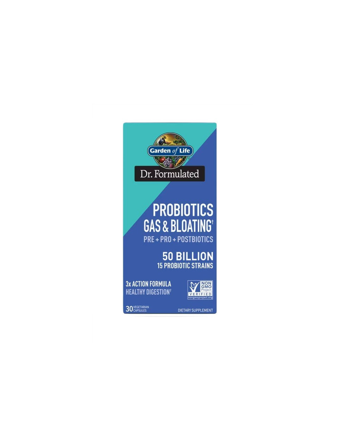 Dr. Formulated Probiotics Gas & Bloating 50 Billion by Garden of Life is a capsule food supplement formulated with a multi-strain probiotic blend, combined with a prebiotic fiber blend and postbiotic metabolites. The product is intended for adult daily use.