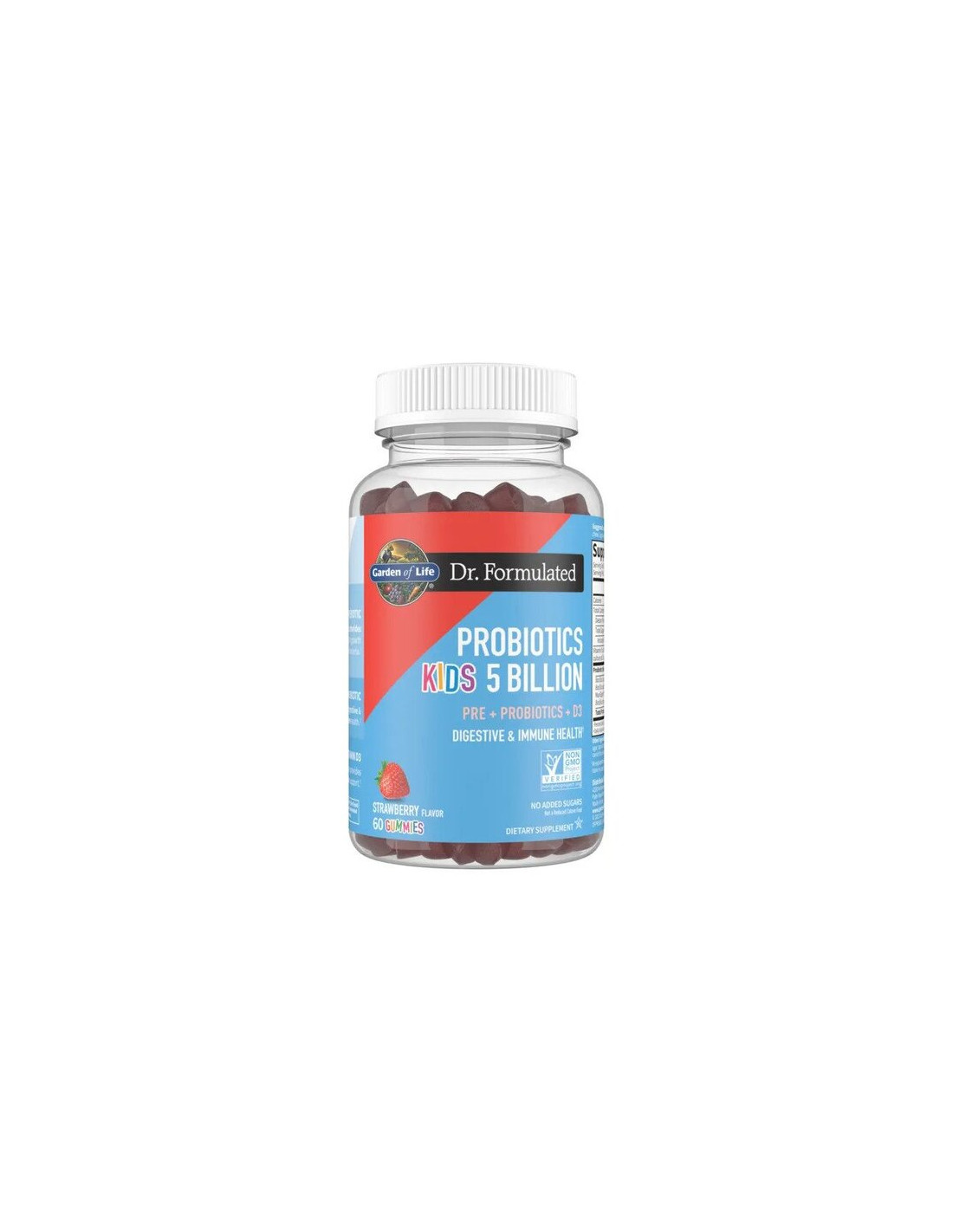 Dr. Formulated Probiotics Kids 5 Billion Gummies by Garden of Life are chewable food supplement gummies formulated for children aged 4 years and older. The product provides selected probiotic cultures combined with vitamin D3 in a gummy format suitable for daily use.