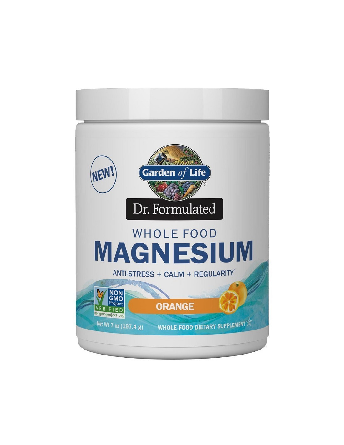 Dr. Formulated Whole Food Magnesium Orange Powder by Garden of Life is a powdered food supplement formulated with magnesium from a blended mineral source, combined with probiotic cultures. The product is intended to be mixed with water and consumed as a daily supplement.