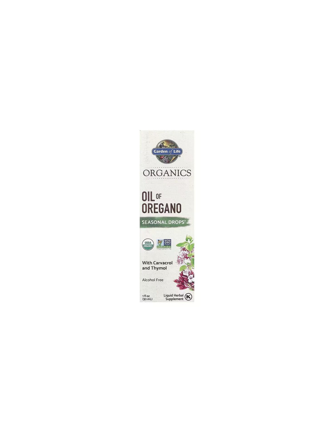 Garden of Life Organics Oil of Oregano Seasonal Drops is a food supplement formulated with organic oregano leaf extract. The liquid drop format allows flexible daily intake and is alcohol free.