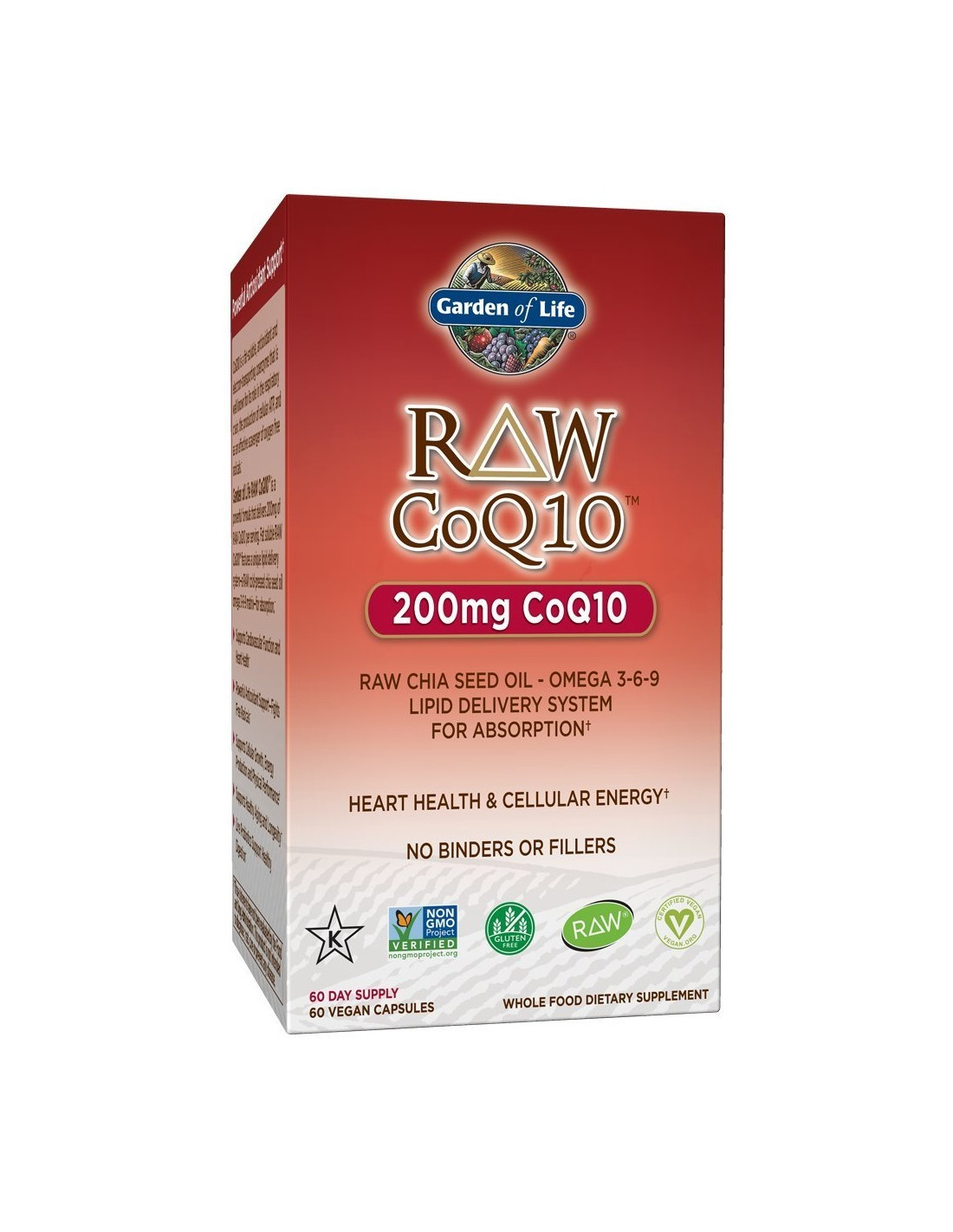 Garden of Life RAW CoQ10 Vegan Capsules is a food supplement formulated with coenzyme Q10 derived from non-animal sources. The formulation includes cold-pressed chia seed oil, organic fruit and vegetable blends, and live probiotics, delivered in a vegan capsule.