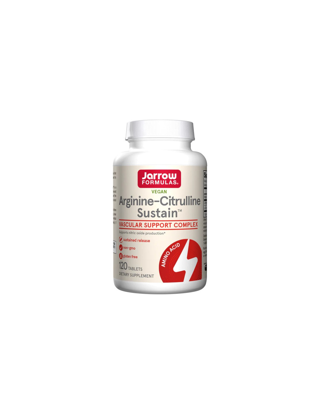 Jarrow Formulas Arginine-Citrulline Sustain is a synergistic combination of two amino acids to support nitric oxide (NO) production, blood flow and cardiovascular health. L-Citrulline largely converts to L-Arginine, increasing circulating and blood vessel levels of L-Arginine for NO production. Arginine-Citrulline Sustain provides these amino acids to the body over an 8 hour period.
