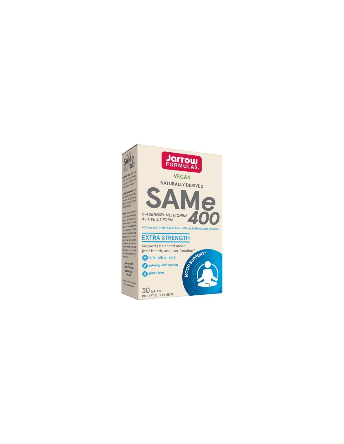Jarrow Formulas® SAMe (S‑Adenosyl Methionine) 400 mg provides a full 400 mg of active SAMe from 800 mg of SAMe tosylate disulfate per tablet. It features a proprietary EnteroGuard® enteric coating to ensure stability and targeted release in the intestines.*