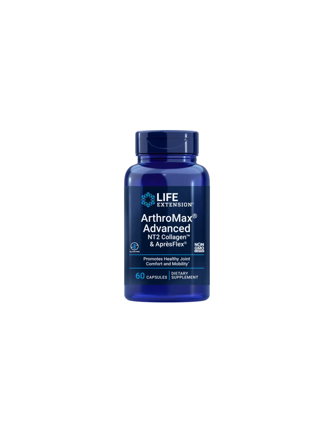Life Extension ArthroMax® Advanced with NT2 Collagen™ & AprèsFlex®, 60 Vegetarian Capsules delivers four clinically studied joint health nutrients per two‑capsule serving: 1,500 mg glucosamine sulfate 2KCI derived from corn, 100 mg AprèsFlex® (Boswellia serrata extract standardized to 20 % AKBA), 40 mg NT2 Collagen™ (standardized cartilage, including 10 mg total collagen) and 1.5 mg boron (as calcium fructoborate FruiteX‑B® OsteoBoron®).* This synergistic blend supports joint mobility, connective tissue integrity and comfort.*
