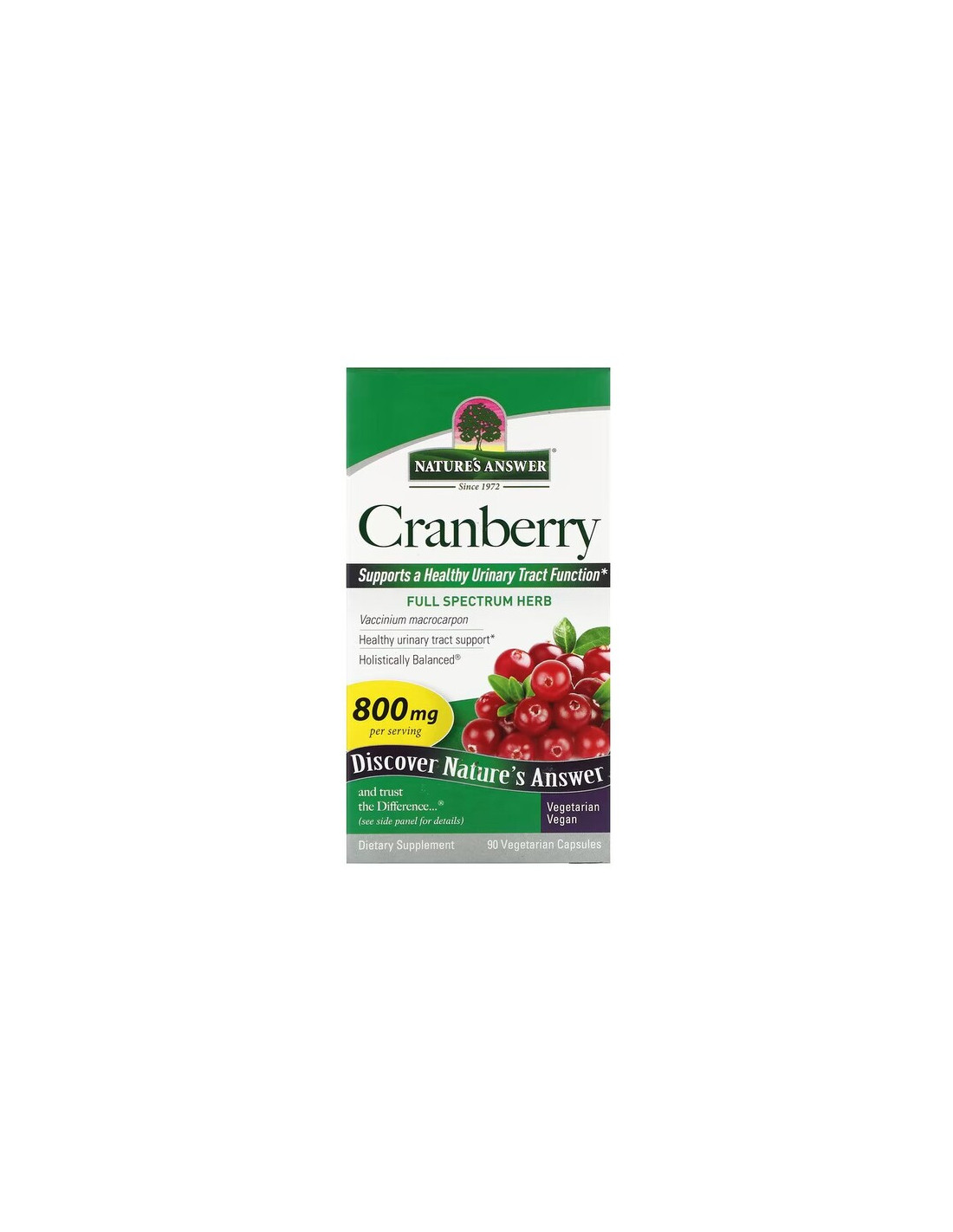 Nature’s Answer Cranberry delivers 800 mg cranberry (Vaccinium macrocarpon) fruit per serving, offered in a simple vegetable capsule format designed for everyday use with meals.