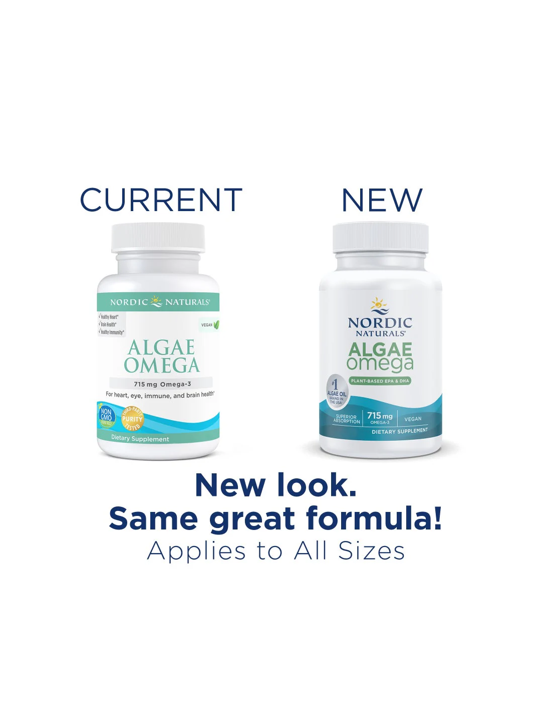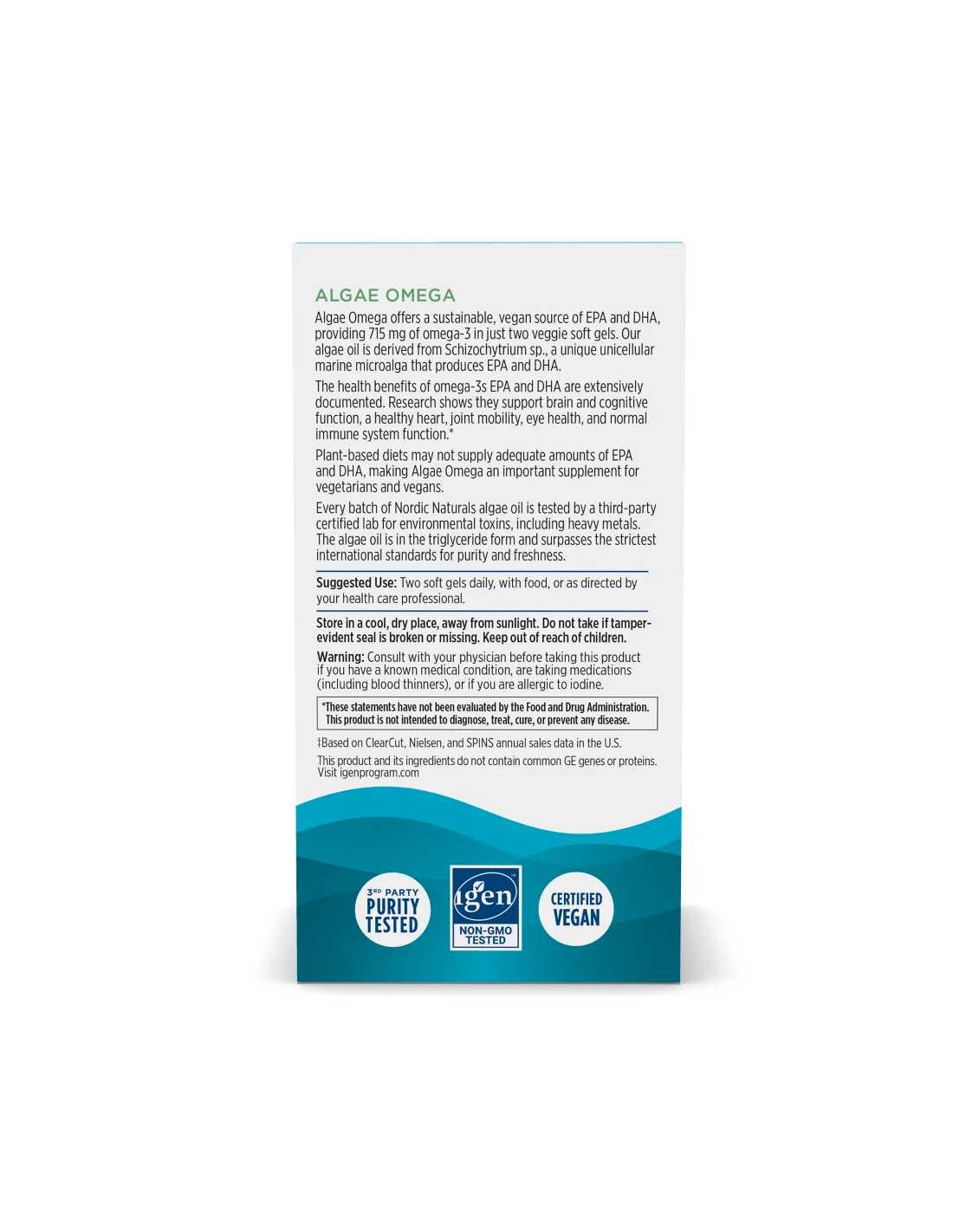 Nordic Naturals Algae Omega delivers a sustainable, plant-based source of omega-3 fatty acids from the microalgae Schizochytrium sp.. Each serving provides 715 mg total omega-3s, including 390 mg DHA and 195 mg EPA, in a high-quality triglyceride form (TG). This product is suitable for vegetarians and free from fish, milk derivatives, and synthetic additives.