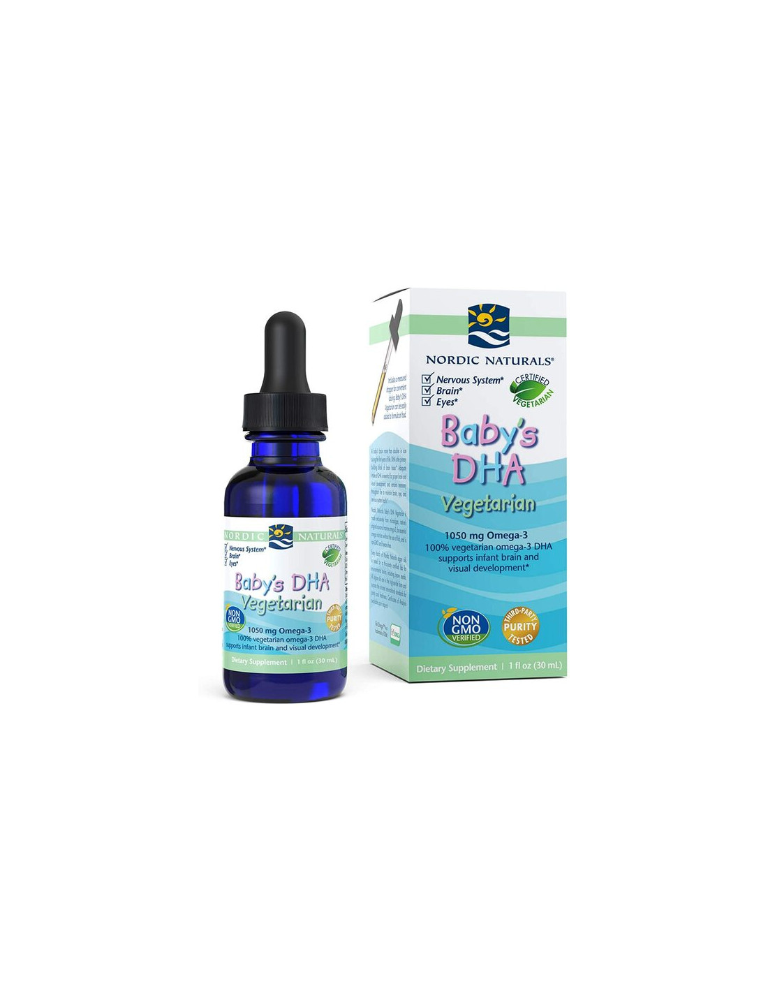 Baby's DHA Vegetarian is a pure, safe, and certified vegetarian source of the omega-3 DHA that your baby needs.*