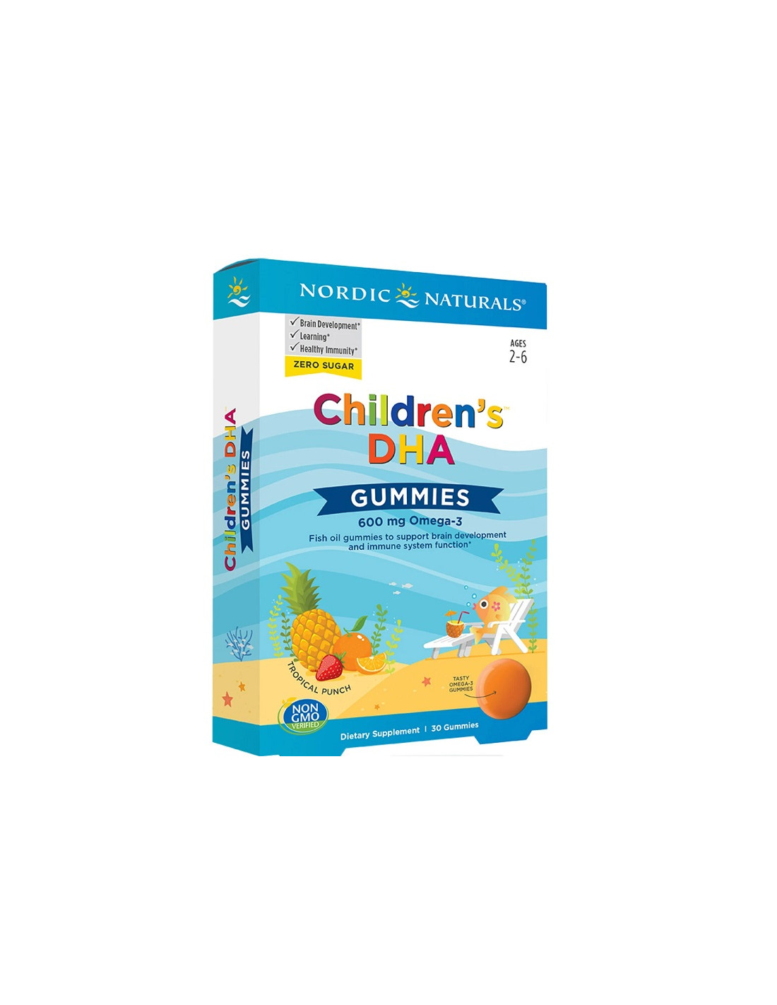 Nordic Naturals Children’s DHA™ Gummy Chews are specially designed omega-3 food supplements for children aged 4 years and older. Each gummy provides 600 mg total omega-3s from pure deep sea fish oil, including 145 mg EPA and 355 mg DHA, in a tasty chewable form with natural flavor and no artificial colorants.