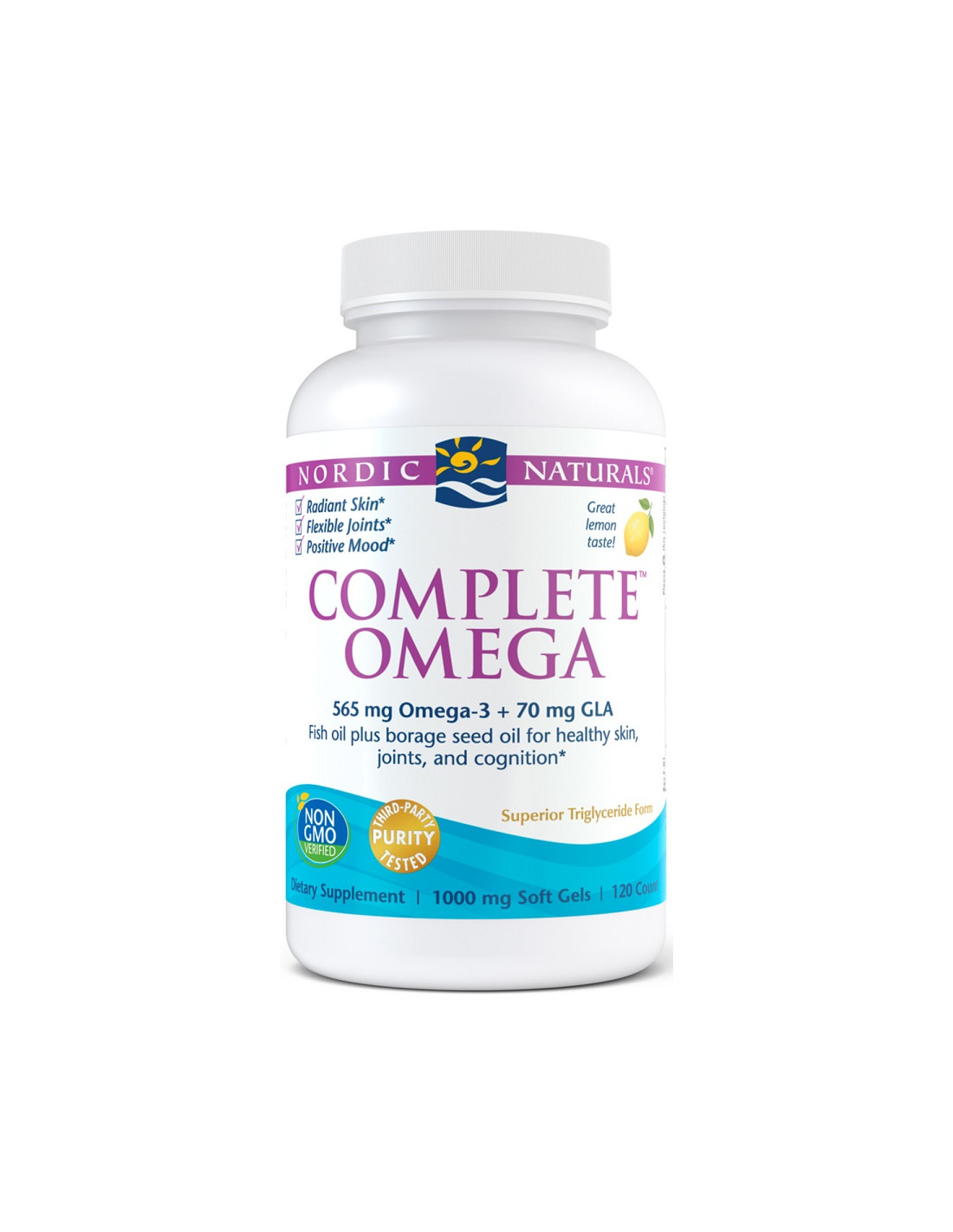 Nordic Naturals Complete Omega® is a food supplement combining omega-3, omega-6, and omega-9 fatty acids for balanced daily intake. It delivers EPA and DHA from fish oil together with GLA and OA from borage seed oil, in a natural triglyceride form for purity and freshness.