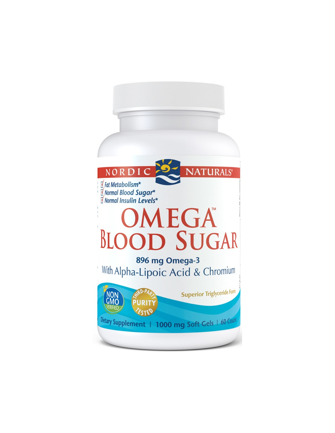 Nordic Naturals Blood Sugar Support combines omega-3 fatty acids from purified deep-sea fish oil with alpha-lipoic acid and chromium in softgel form. Each serving supplies EPA, DHA and other omega-3s in triglyceride form, alongside chromium nicotinate glycinate chelate. The product is free from gluten, milk derivatives and synthetic dyes.