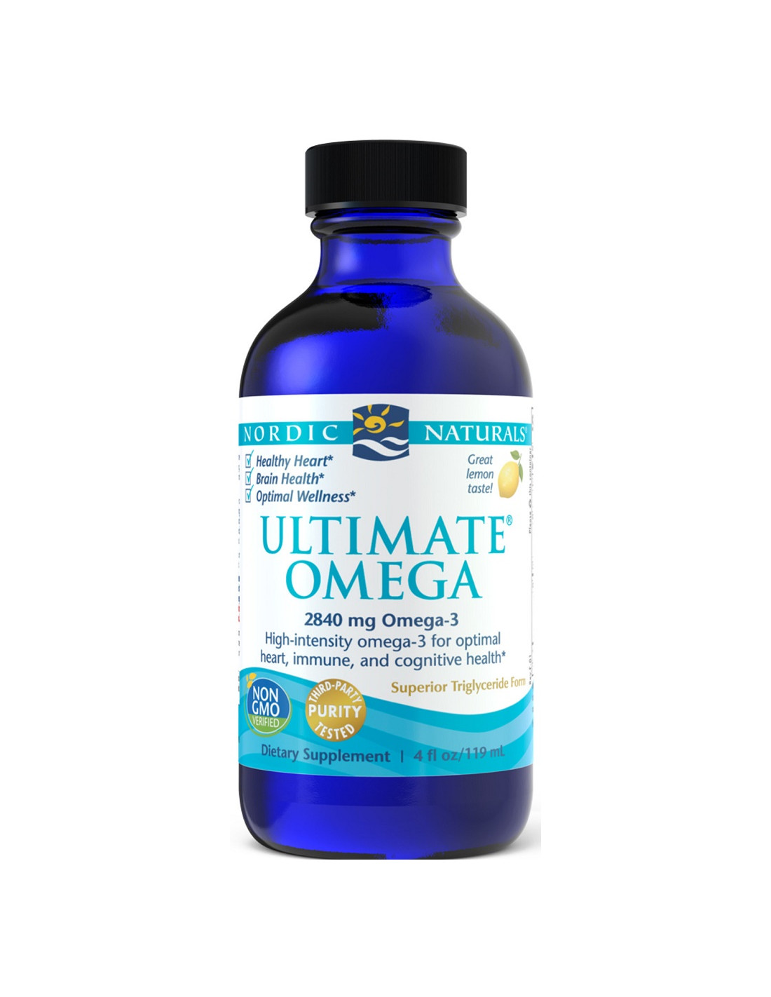 Nordic Naturals Ultimate Omega in liquid form provides a potent dose of omega-3 fatty acids in natural triglyceride (rTG) form. Each teaspoon (5 mL) delivers 2,840 mg total omega-3s, including 1,460 mg EPA and 1,010 mg DHA. Naturally flavoured and purified for exceptional freshness and quality.