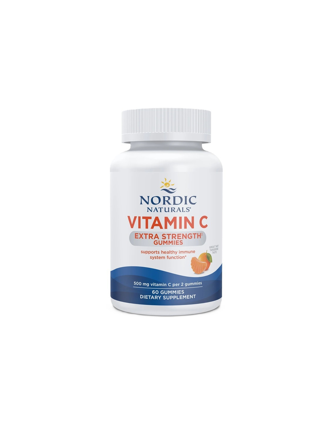 Nordic Naturals Vitamin C Extra Strength Gummies deliver 500 mg of vitamin C per serving in a tasty, pectin-based gummy. Manufactured with natural ingredients, these gummies are free from gluten, milk derivatives, and synthetic dyes, providing a convenient way to support daily vitamin C intake.