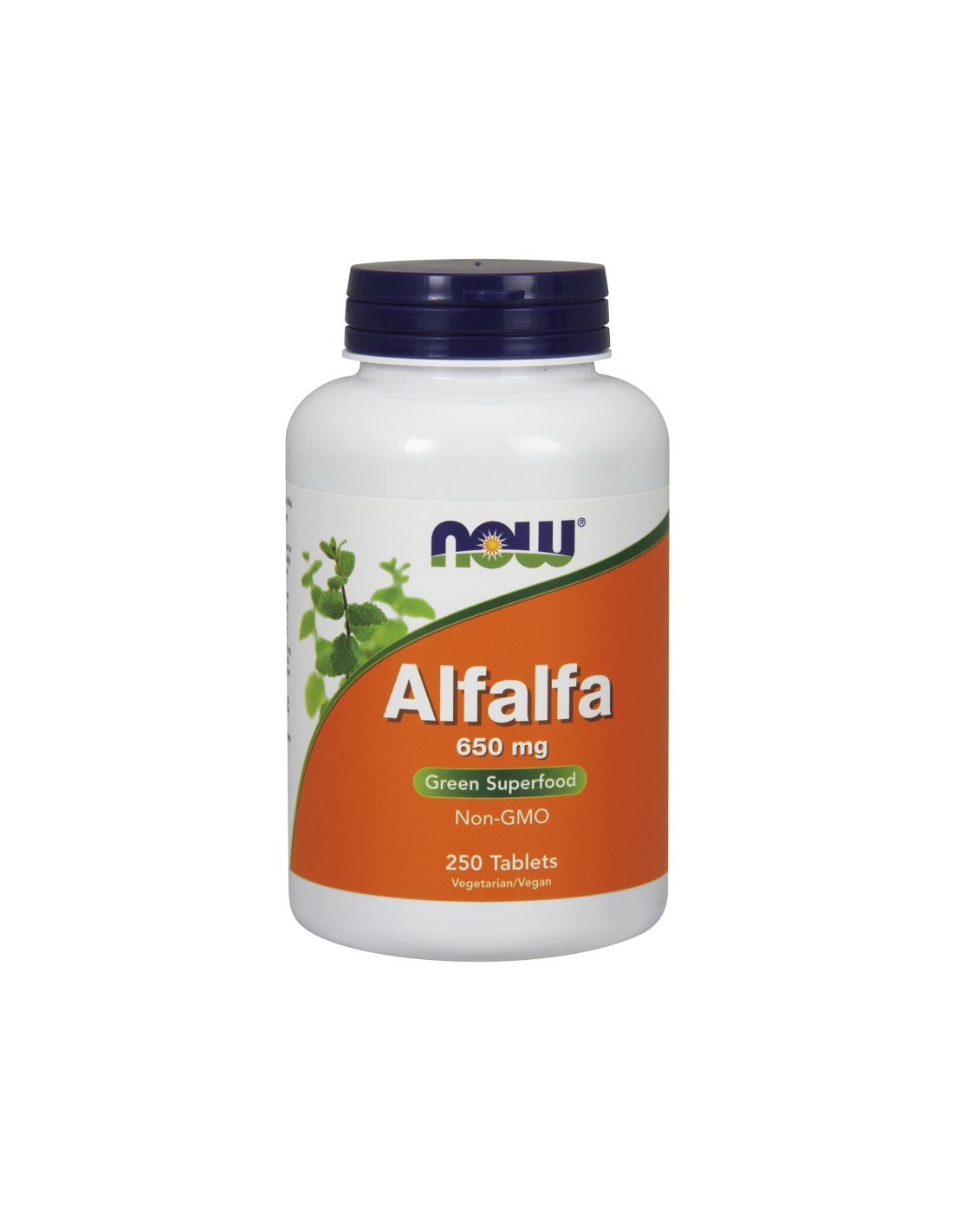 NOW® Alfalfa 650 mg Tablets deliver 1,950 mg of alfalfa (Medicago sativa) per serving of 3 tablets. This natural formula reflects the nutrient profile of genuine whole foods and is produced in a GMP-certified facility with globally sourced ingredients.
