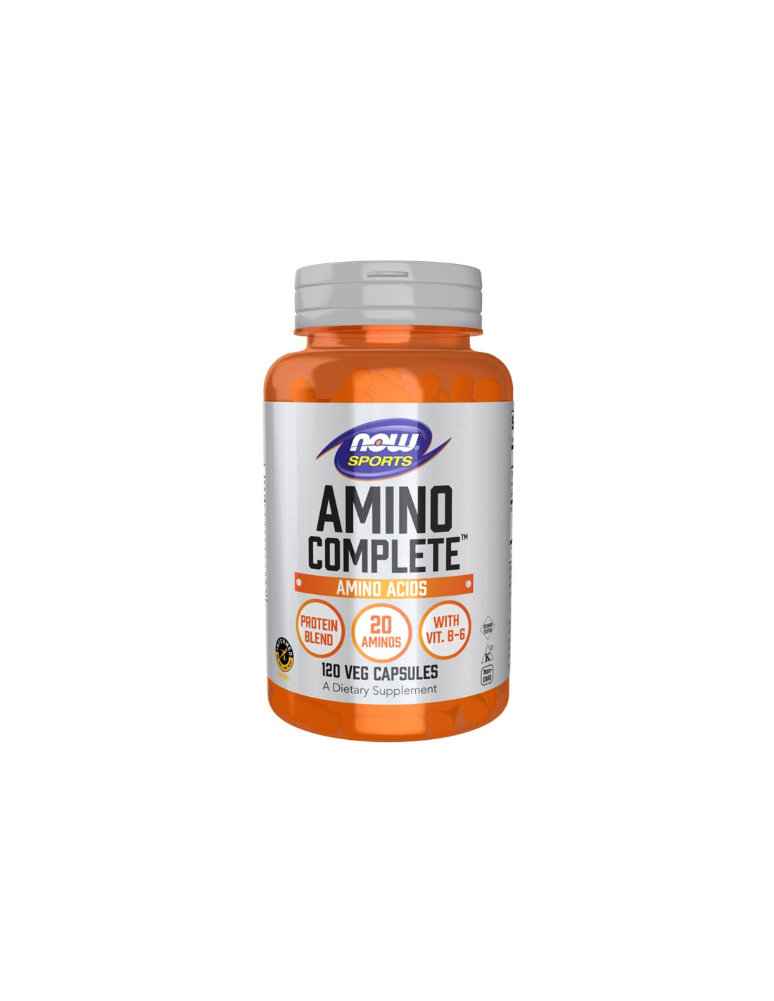 NOW® Amino Complete Veg Capsules combine peptide-bound amino acid sources (whey protein isolate, soy protein isolate, sodium caseinate) with free-form amino acids including L-glutamine, L-arginine, and L-ornithine. Each 4-capsule serving provides 2 g of protein and 13 mg of vitamin B-6, alongside a complete spectrum of essential and non-essential amino acids.