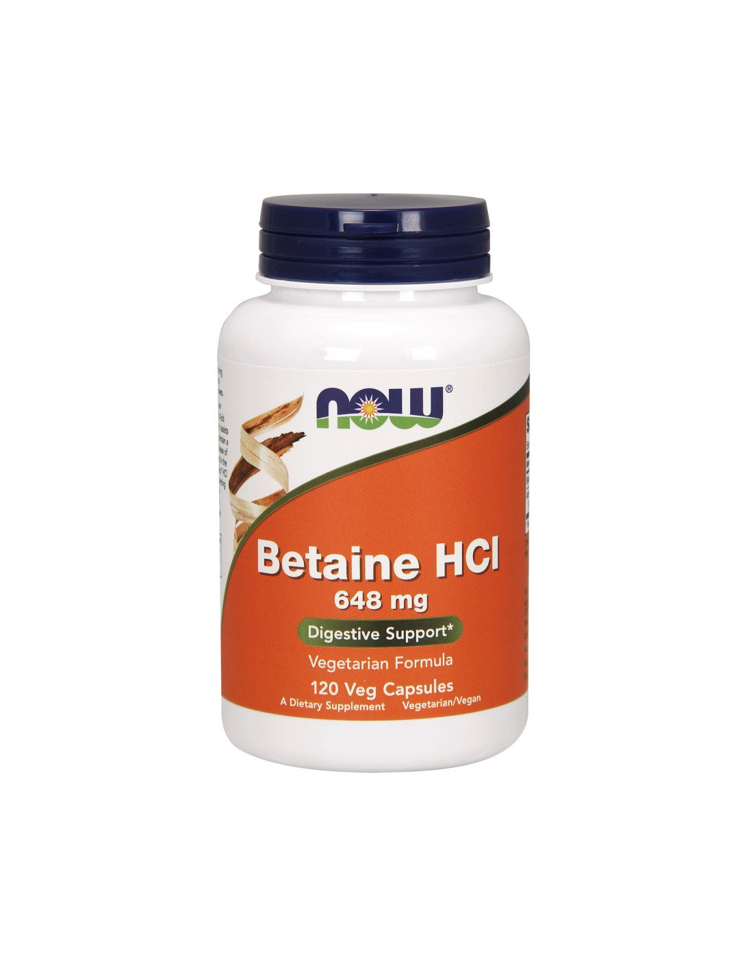 NOW® Betaine HCl 648 mg Veg Capsules provide a straightforward two-component formula in vegetarian capsules: betaine hydrochloride and an acid-stable protease (fungal pepsin from Aspergillus niger). Produced in a GMP facility; made and quality tested in the USA.