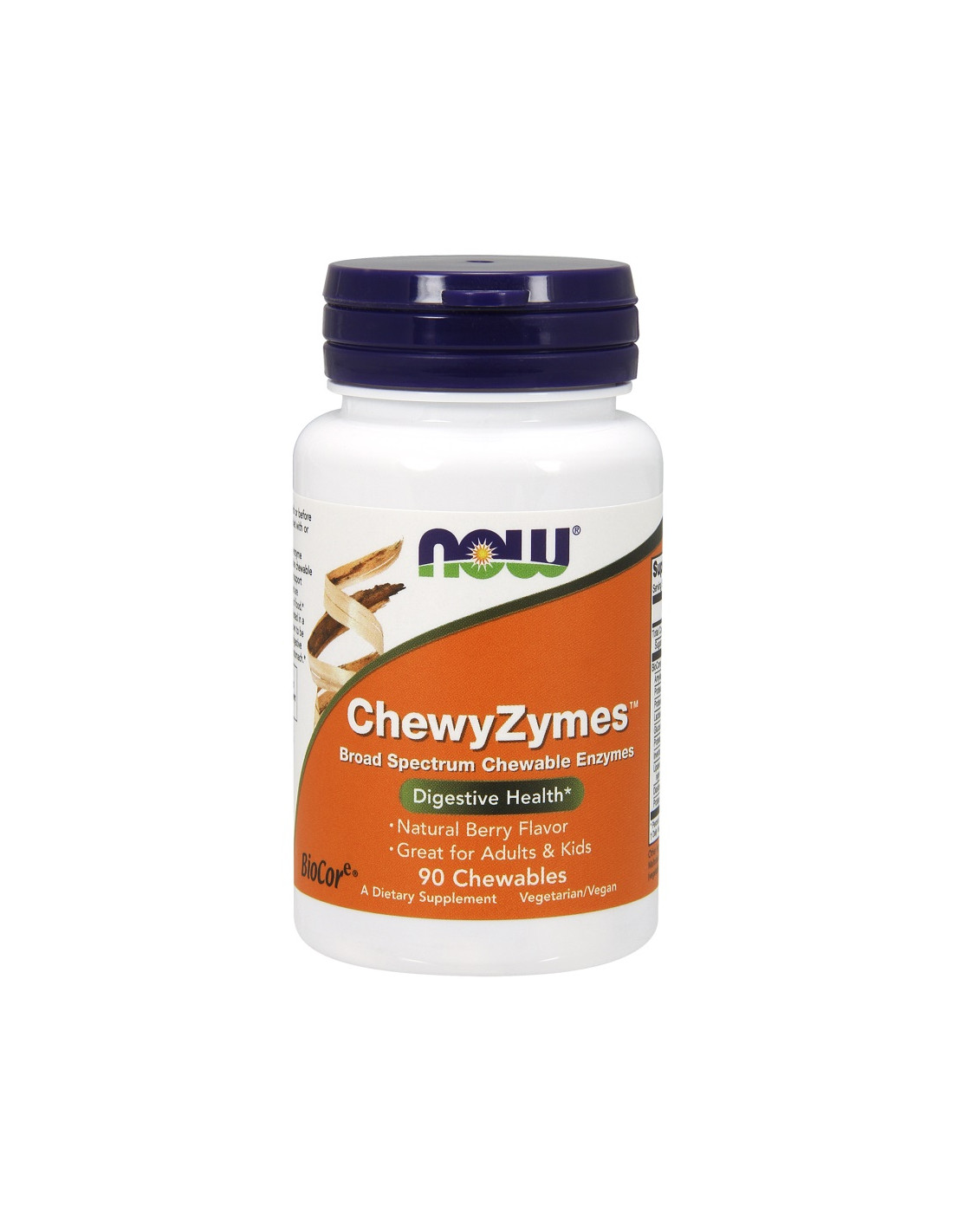 NOW® ChewyZymes® Chewables provide a vegetarian enzyme blend in a convenient chewable form. Each serving supplies BioCore Kids® enzymes including amylase, protease, lactase, lipase, and others.