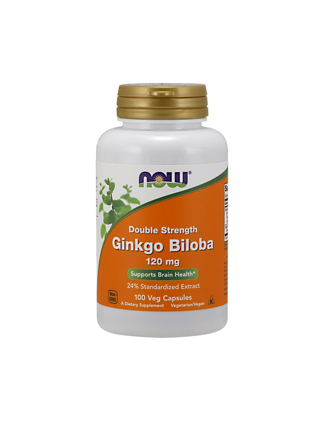 NOW® Ginkgo Biloba Double Strength 120 mg Veg Capsules provide a standardized 50:1 ginkgo extract with a guaranteed minimum of 24% ginkgoflavonglycosides and 6% terpene lactones. This double-strength formula delivers twice the potency of the standard 60 mg capsules and is further supported with organic eleuthero root for a full-spectrum herbal composition.