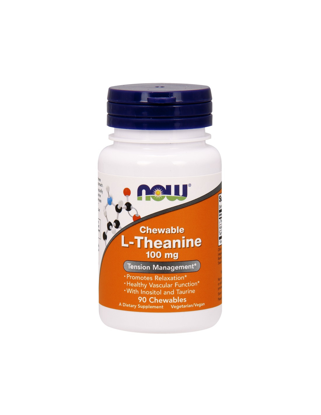 NOW® L-Theanine 100 mg Chewables provide 100 mg L-theanine per chewable tablet, complemented with inositol and taurine. This vegetarian-friendly formula is free from common allergens and manufactured in a GMP-certified facility with globally sourced ingredients.