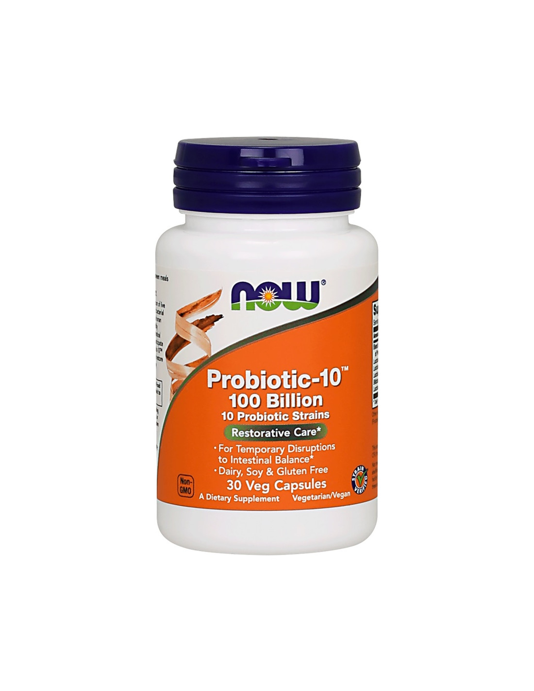 NOW® Probiotic-10™ 100 Billion Veg Capsules deliver 100 billion CFU from a carefully selected blend of 10 probiotic strains per capsule. The formula includes Lactobacillus, Bifidobacterium, and Streptococcus thermophilus strains, verified by DNA-fingerprinting for identity and purity. Produced without common allergens and suitable for vegetarians.
