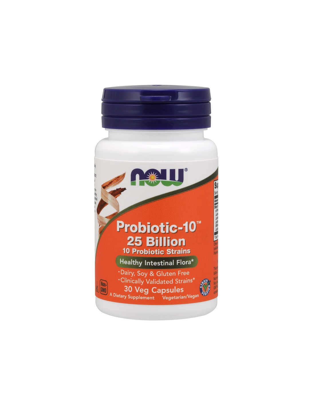 NOW® Probiotic-10™ delivers a balanced spectrum of live organisms consisting of acid-resistant probiotic bacterial strains. Each capsule provides 25 billion CFU, combined with prebiotic FOS to support a balanced composition. Produced in a GMP facility and quality tested in the USA with globally sourced ingredients.