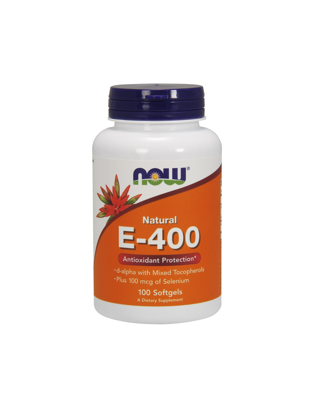 NOW® Vitamin E-400 Softgels provide d-alpha tocopherol with mixed tocopherols and selenium in convenient softgels. The composition and serving information follow the official manufacturer’s label.