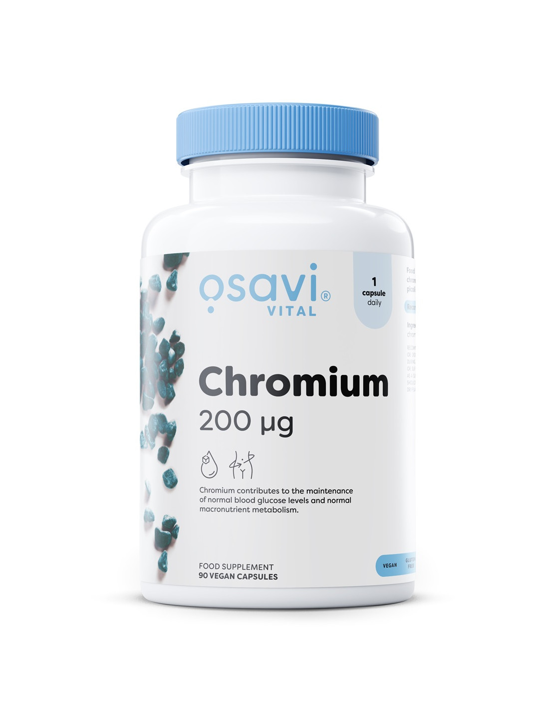 Osavi Chromium contains 200 µg of chromium per capsule in a highly bioavailable picolinate form. Chromium contributes to the maintenance of normal blood glucose levels and to normal macronutrient metabolism, as approved by EFSA. The product is vegan, non-GMO, and made according to EU quality standards.