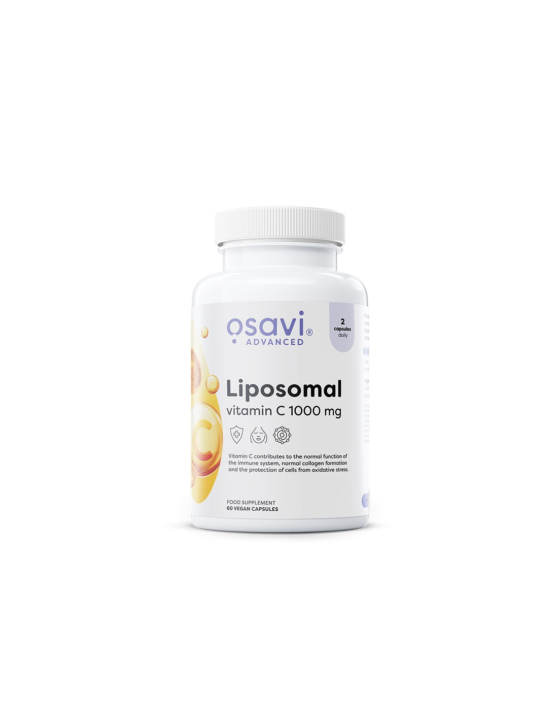 Osavi Liposomal Vitamin C delivers vitamin C (L-ascorbic acid) in a modern liposomal form known as Liposovit®-C, designed for optimal bioavailability and gastrointestinal tolerance. Each 2-capsule serving provides 1000 mg of vitamin C, a nutrient essential for various metabolic processes. The formula is vegan, non-GMO, and produced according to strict EU quality standards.