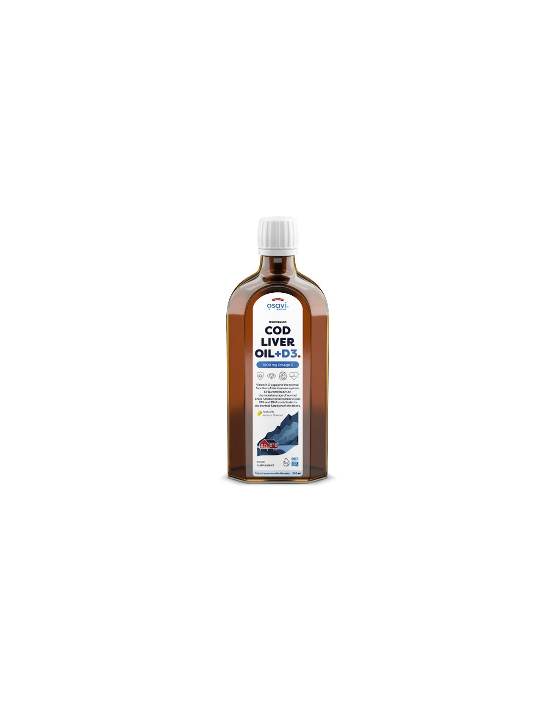 Premium Norwegian cod liver oil enriched with natural lemon flavour, combining essential omega-3 fatty acids (EPA and DHA) with vitamins A and D3. Each 5 ml serving provides 4600 mg cod liver oil, including a minimum of 1000 mg omega-3s, 270 µg vitamin A and 50 µg (2000 IU) vitamin D3. Data verified from the official Osavi product label.