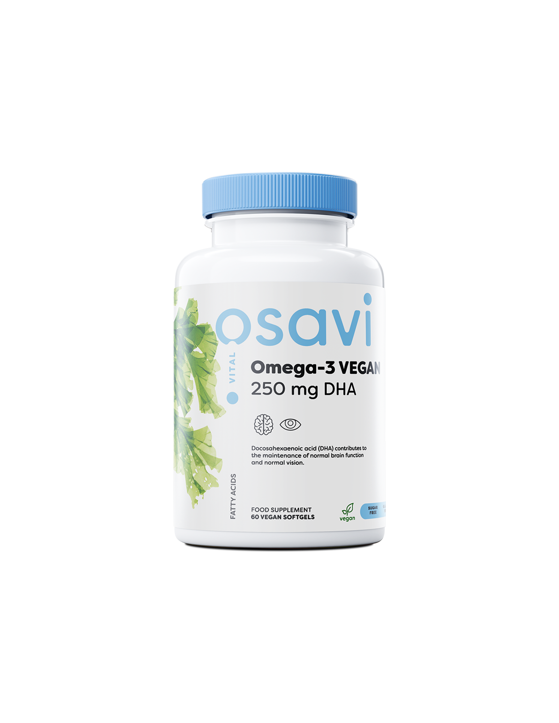 Osavi Omega-3 Vegan 250 mg DHA is a high-quality vegan source of omega-3 fatty acids derived from microalgae oil (Schizochytrium sp.). Each capsule provides 454 mg of algae oil, with at least 250 mg of DHA (docosahexaenoic acid). This clean, sustainable formulation offers a reliable alternative to traditional fish oil supplements.