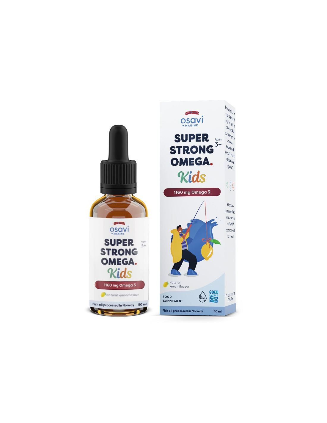 Osavi Super Omega Kids is a premium-quality fish oil supplement formulated especially for children. Each 2 ml serving delivers 1160 mg total omega-3 fatty acids, including 580 mg EPA, 400 mg DHA, and 180 mg other omega-3s. Made from purified fish oil in triglyceride form for optimal quality and absorption, with a pleasant natural lemon flavour that kids will enjoy. Verified from the official Osavi product label.