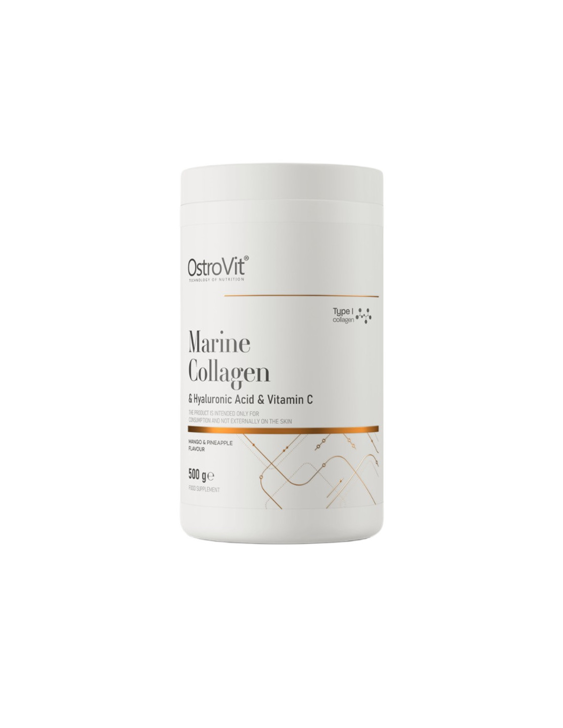 OstroVit Marine Collagen is a powdered food supplement formulated with hydrolysed fish collagen peptides, hyaluronic acid and vitamin C. The product is intended for daily use and provided in a flavoured powder form.