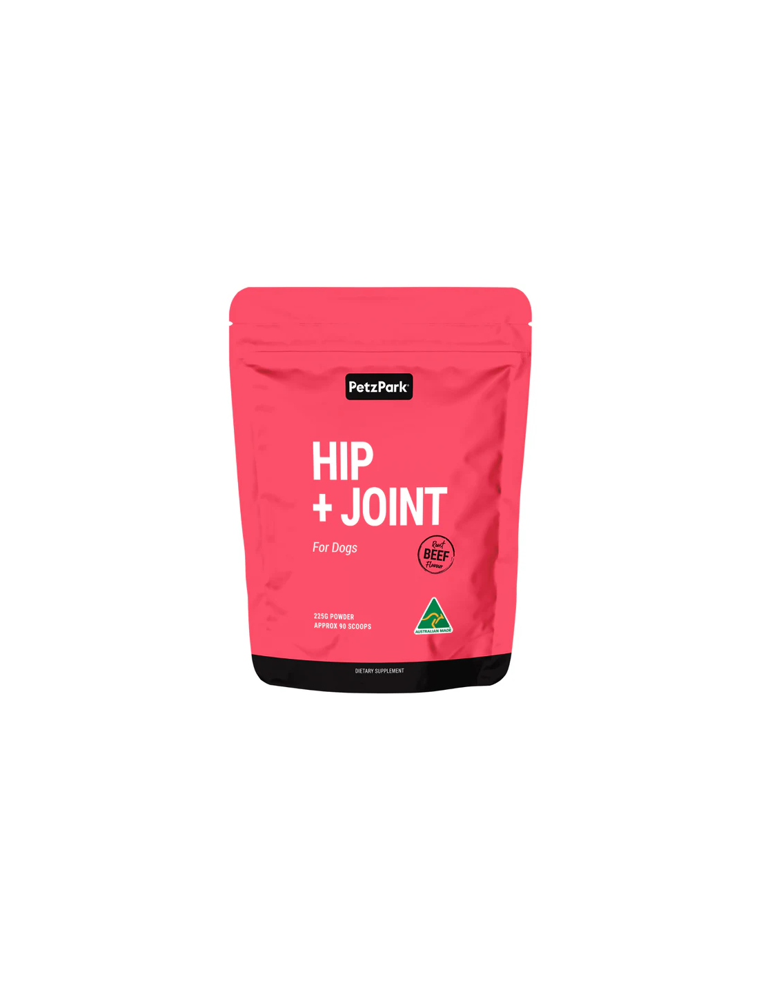 Petz Park Hip + Joint for Dogs is a palatable, grain-free powder for dogs, designed to be mixed with food. The per-scoop composition is declared below. Roast-beef flavour only (no meat content). Suitable for dogs of any age, size and breed. Manufactured in Australia.