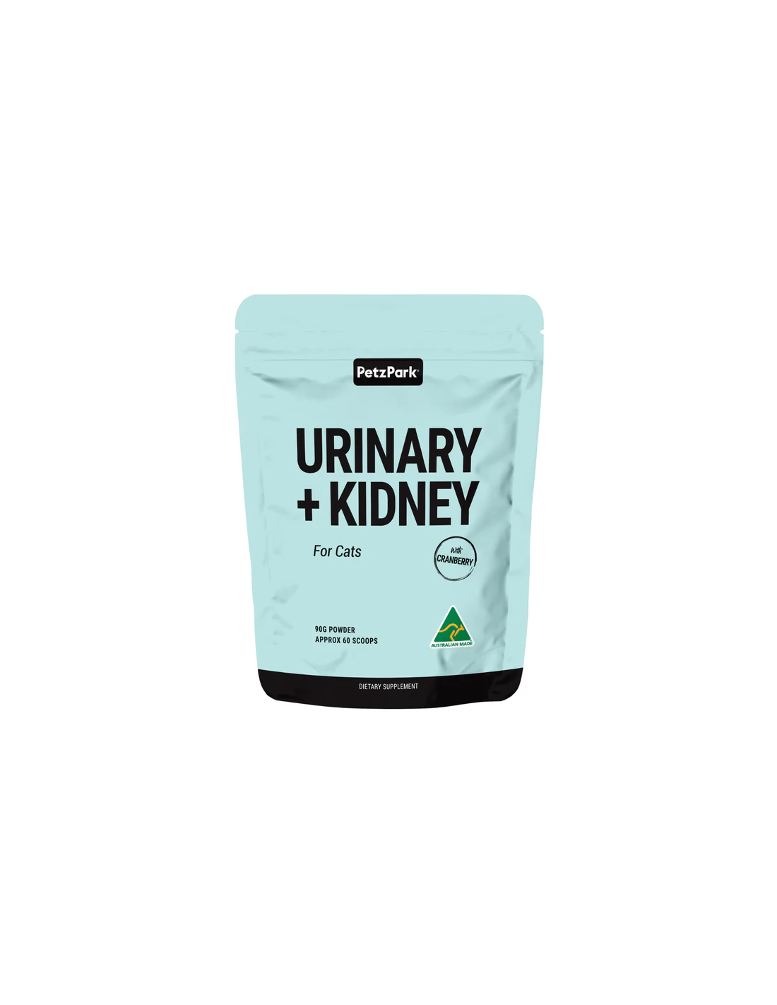 Petz Park Urinary + Kidney for Cats is a palatable, grain-free powder for cats, designed to be mixed with food. The per-scoop composition and feeding guidance are declared below. Fish flavour only (no meat/fish content). Suitable for cats of any age or breed. Manufactured in Australia.