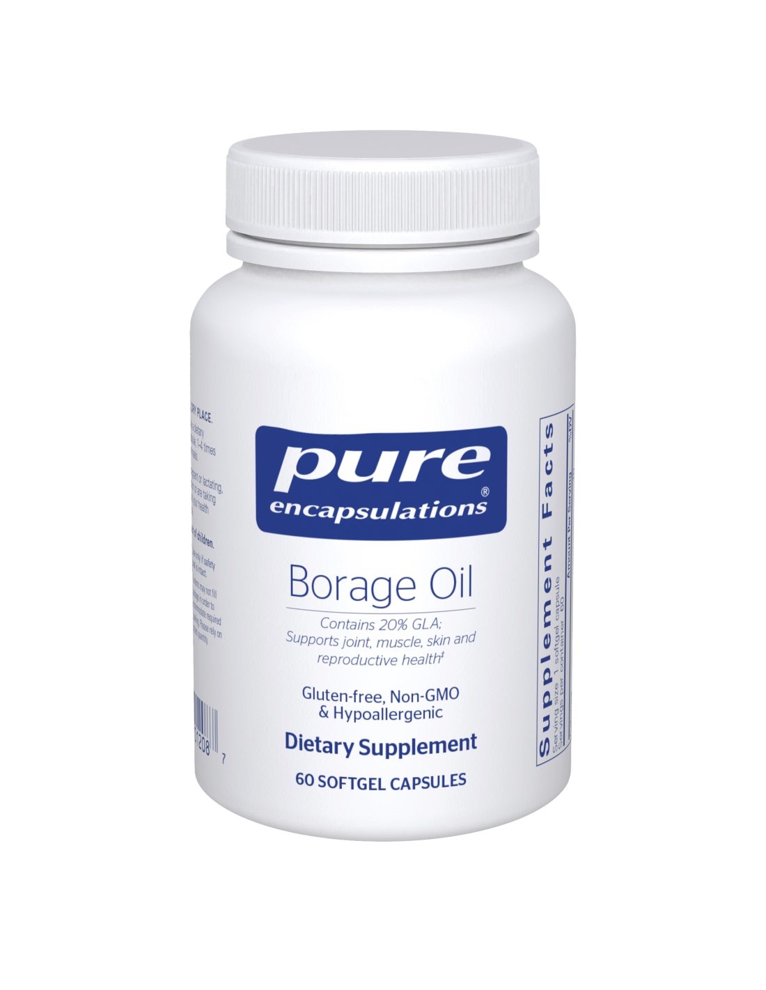 Borage Oil by Pure Encapsulations provides 20% of the omega-6 fatty acid gamma-linoleic acid (GLA), and provides 1,000 mg Borage per serving. There is also vitamin E included.