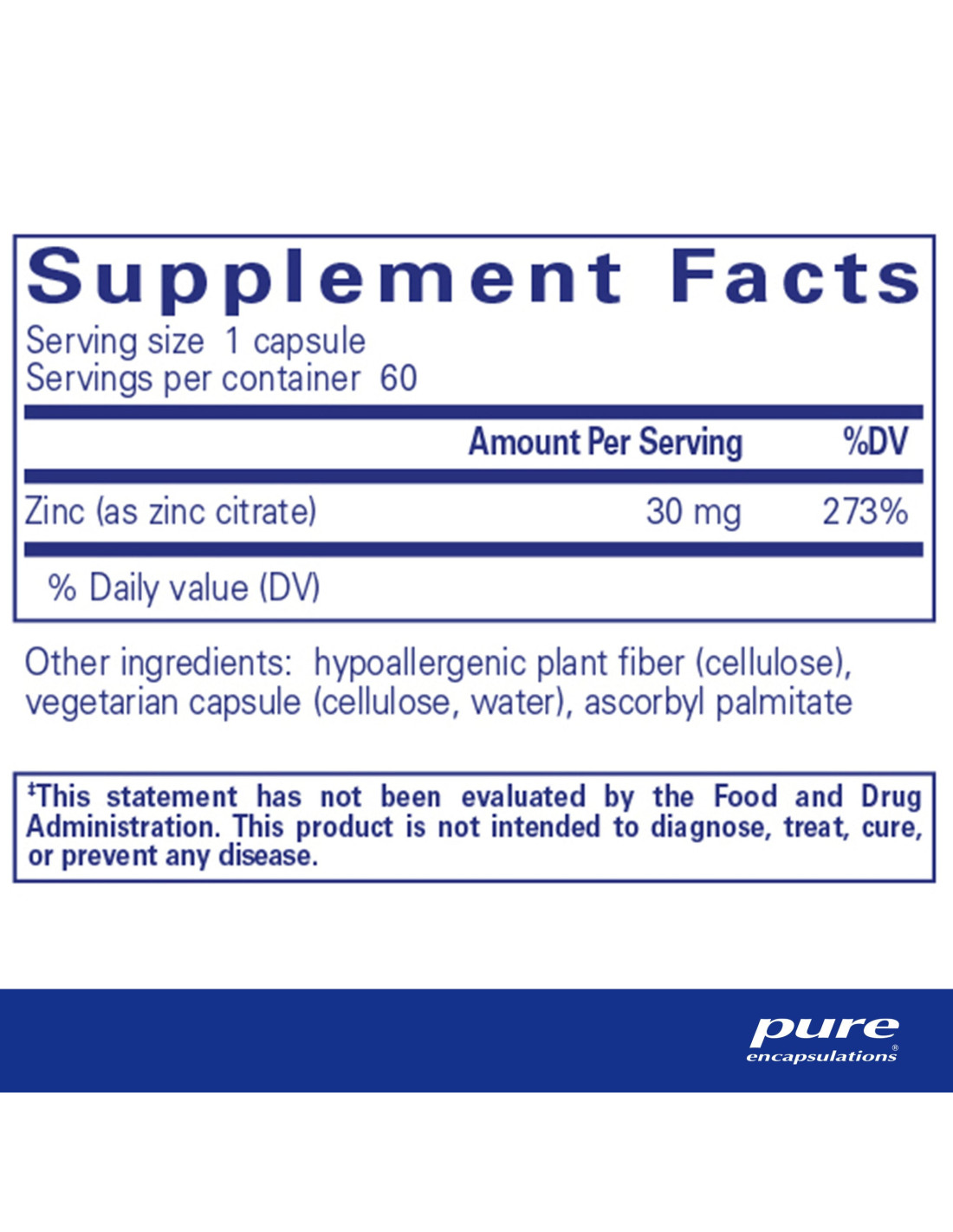 Zinc (citrate) by Pure Encapsulations provides 30mg of zinc in the highly bioavailable citrate form. Zinc is a key mineral that can support many aspects of health.