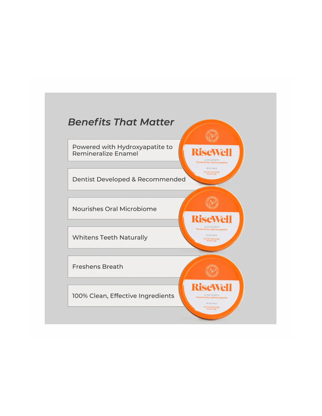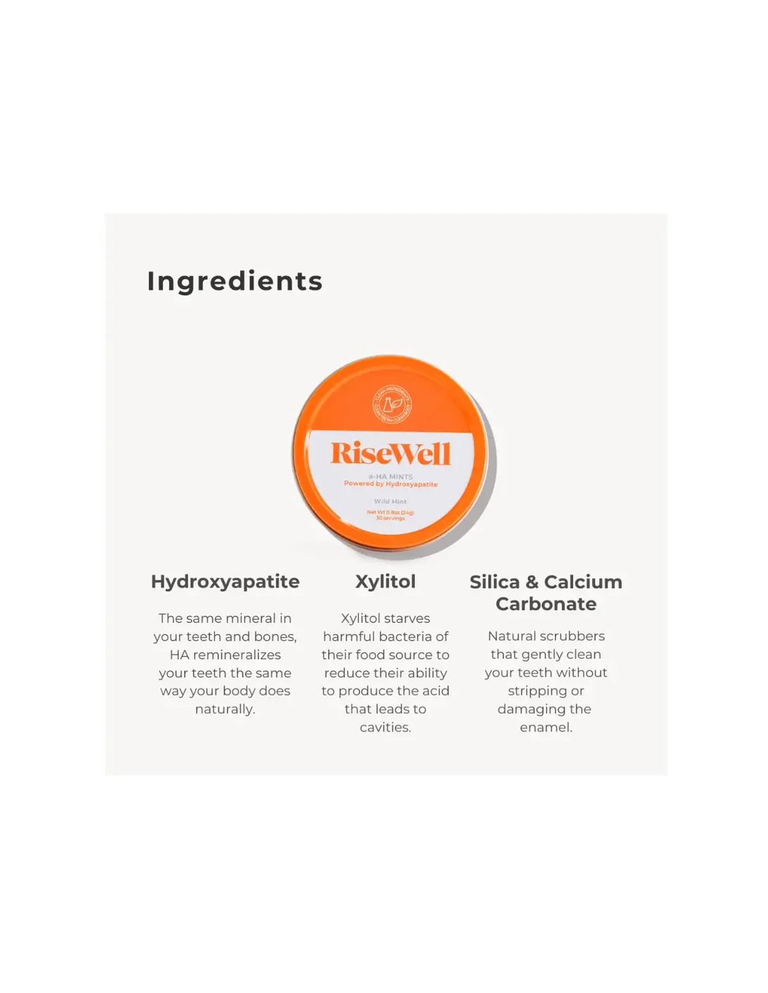 RiseWell A-HA Mints are oral care mints designed to freshen breath and contribute to clean teeth while out and about. Formulated with hydroxyapatite, xylitol, calcium carbonate and silica, these sugar-free mints support oral hygiene and help maintain a comfortable, clean feeling after meals as part of a regular dental care routine.